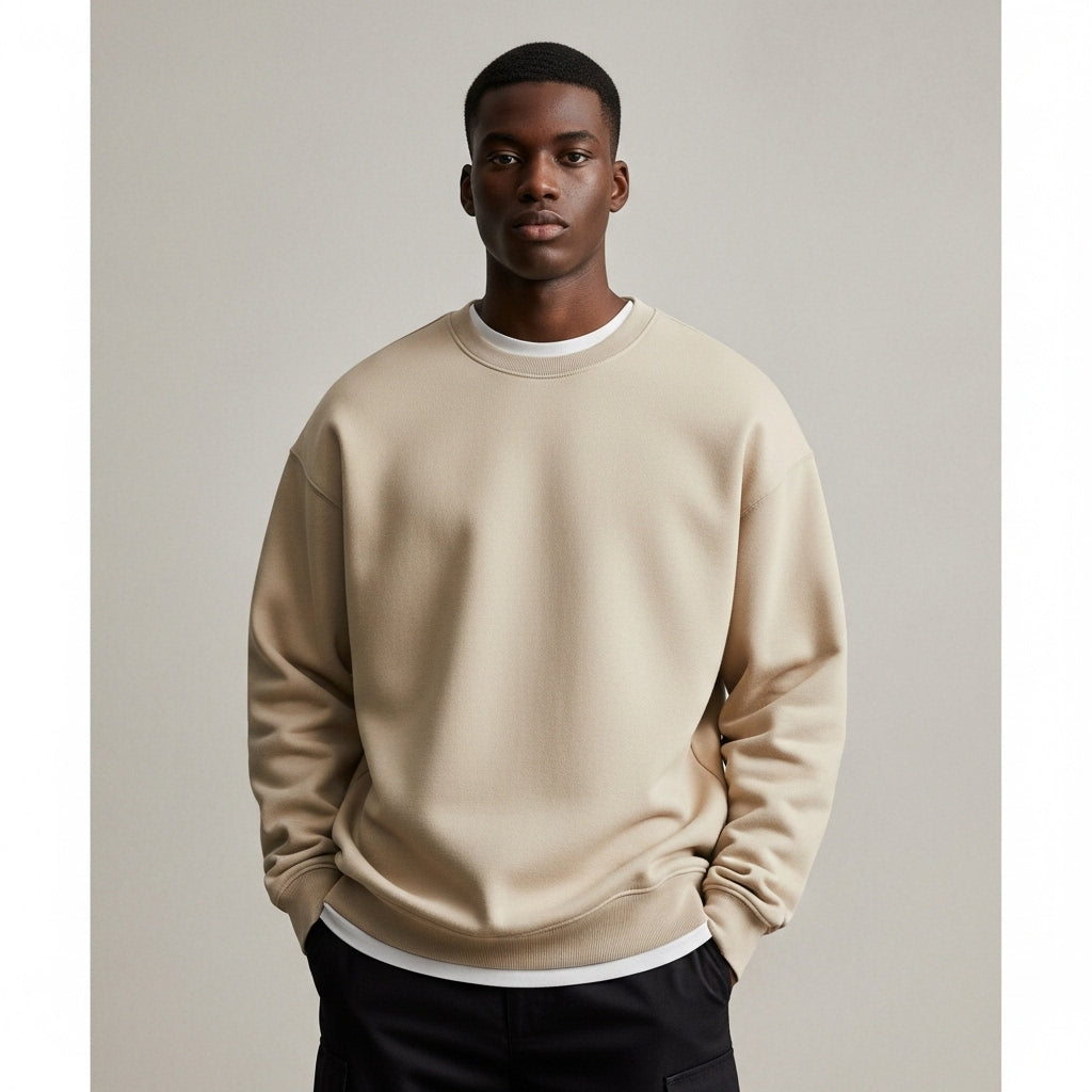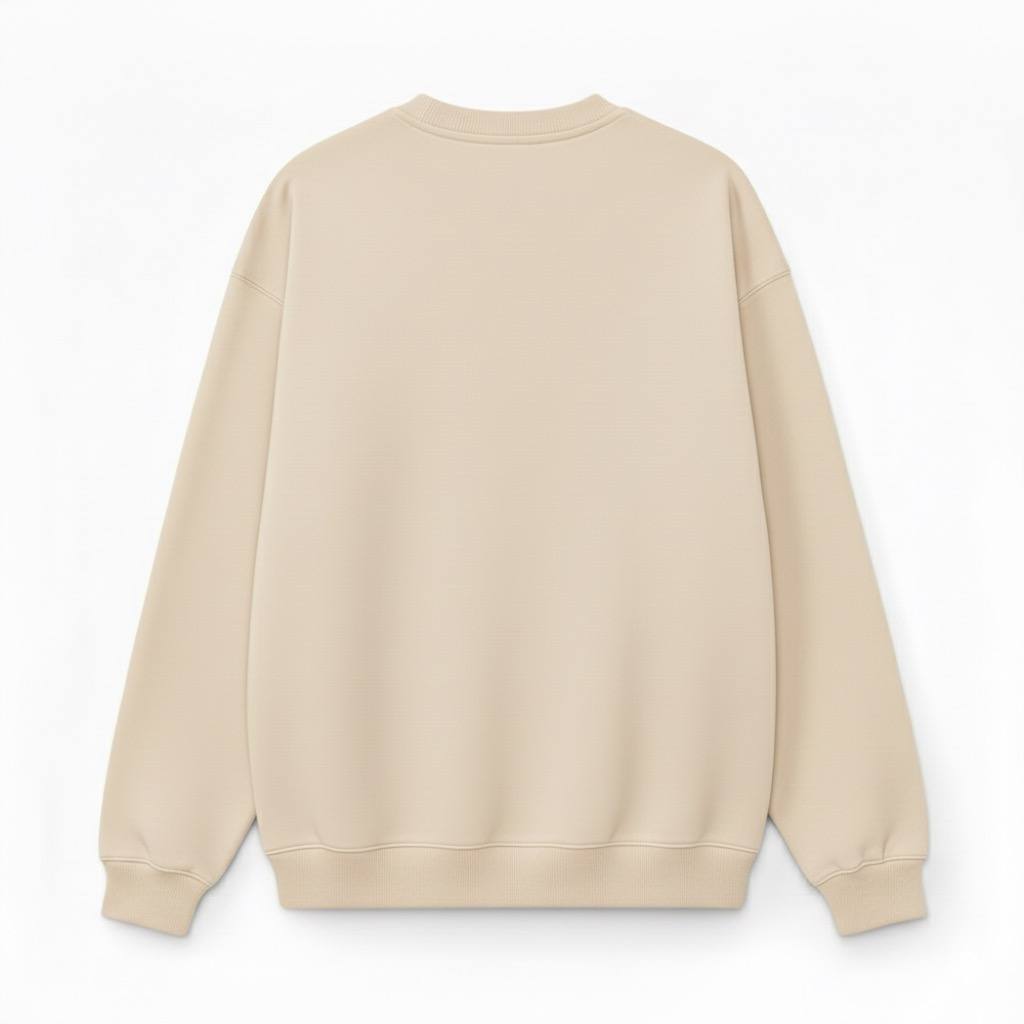 Beige oversized sweatshirt made from high-quality Milton mixed fabric. The outer layer is 100% cotton, providing a soft and smooth texture, while the inner layer is a blend of 75% cotton and 25% polyester for added warmth and durability. Designed with a relaxed, oversized fit for ultimate comfort and a modern casual look.