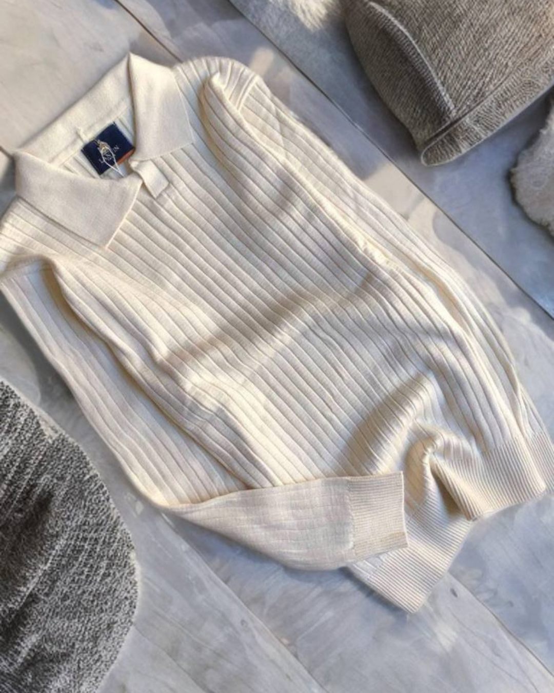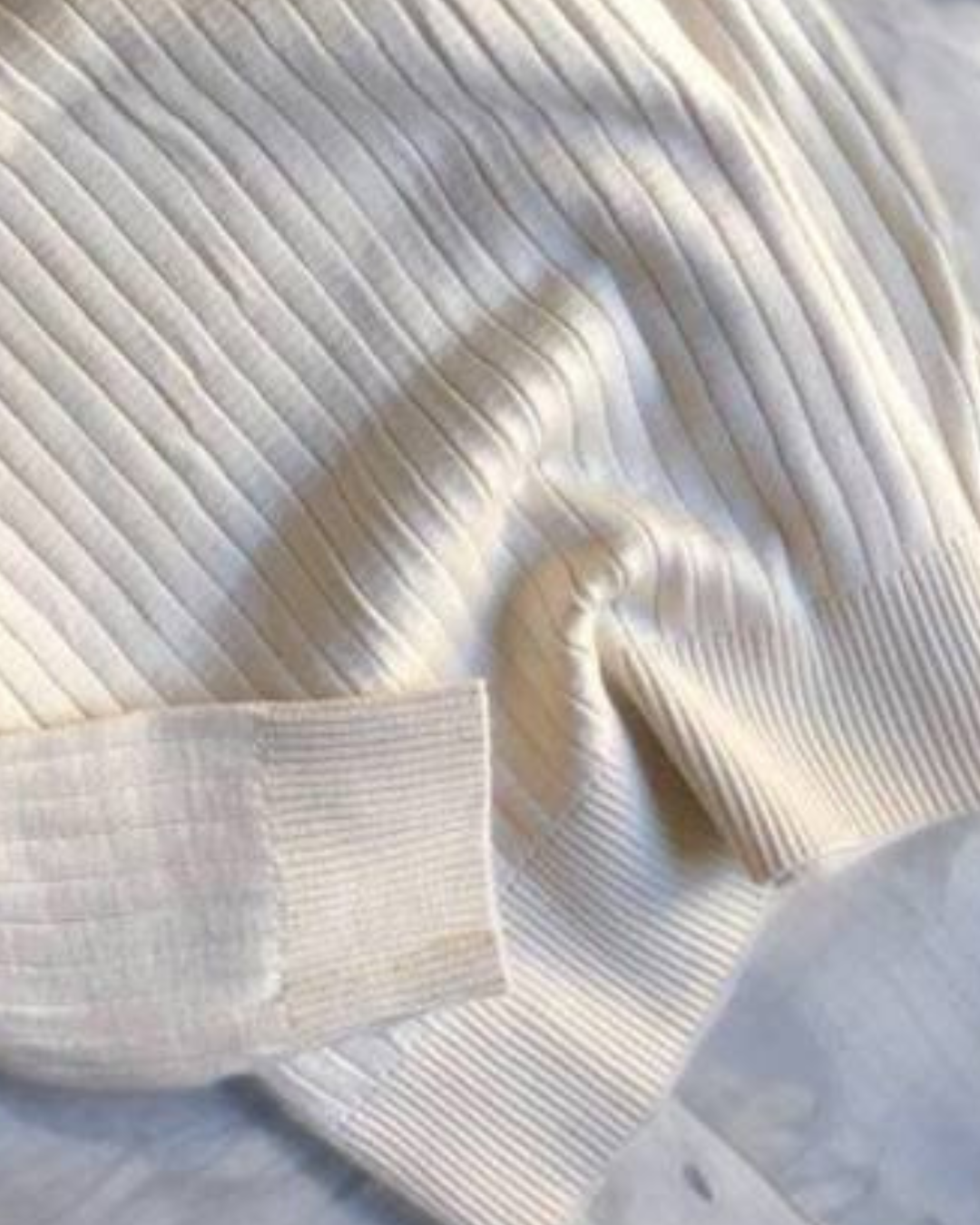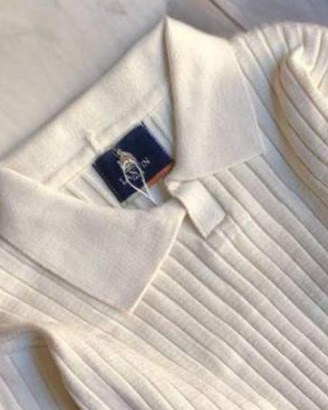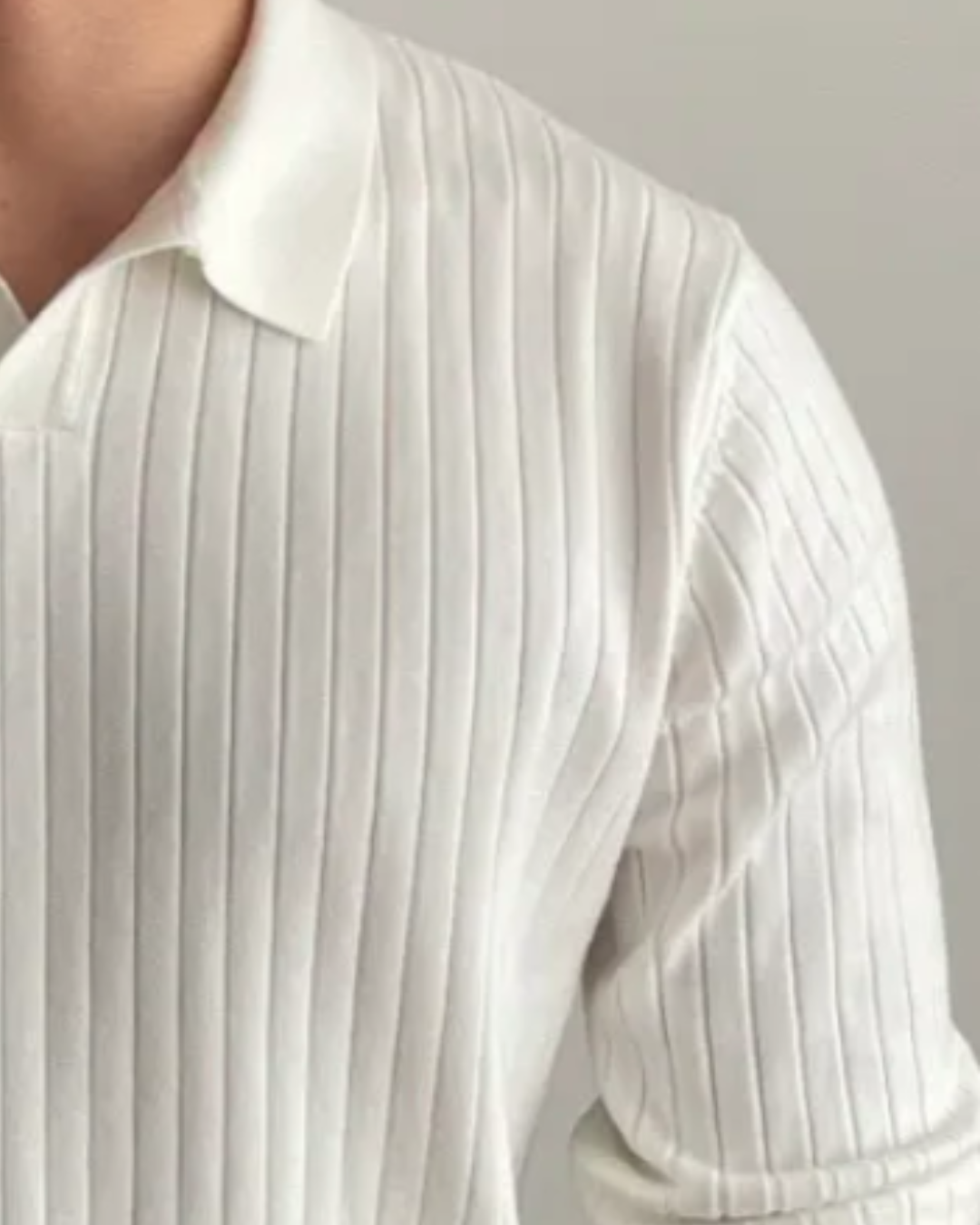 Slim-fit ribbed pullover featuring a classic collar and a half placket neckline. It comes in solid Off-White , designed with vertical ribbed texture that adds a refined, modern touch. Made from a soft, stretchable knit fabric, it offers both comfort and a tailored silhouette, perfect for smart-casual or semi-formal looks.