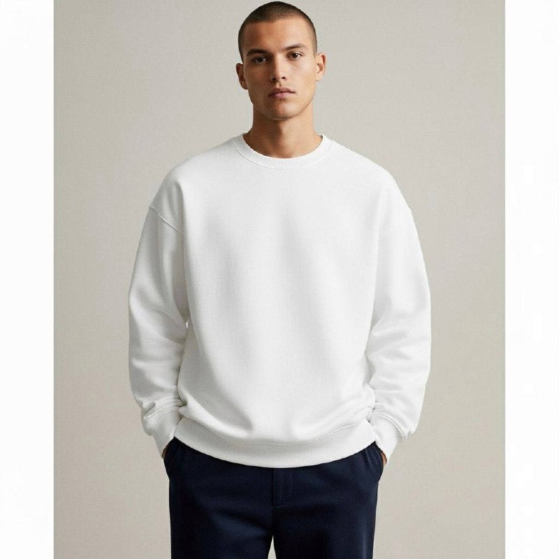 White oversized sweatshirt made from high-quality Milton mixed fabric. The outer layer is 100% cotton, providing a soft and smooth texture, while the inner layer is a blend of 75% cotton and 25% polyester for added warmth and durability. Designed with a relaxed, oversized fit for ultimate comfort and a modern casual look.